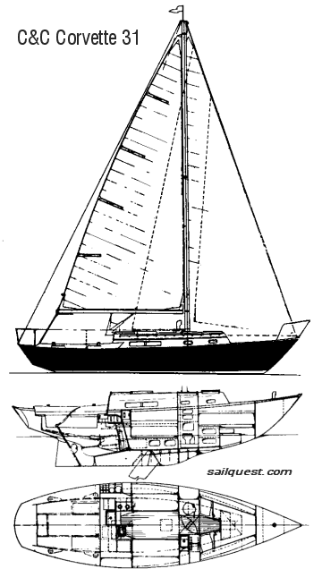 The Corvette 31 was designed in 1965 and most were built in the late 1960s. This is one of the boats that helped establish C&C as a household name in the Canadian boating industry. These boats have a graceful traditional look about them, and they continue to enjoy a loyal following. The Corvette has a retractable keel incorporated into its full keel. With the swing keel all the way up, the Corvette only draws 3'3" (1m), making it an excellent boat for shallow water areas. It has a very livable interior, but it is a little small when compared to later designs. Because of when they were built, Corvettes were equipped with the Atomic 4 gasoline engine, although some have since been repowered with diesels. It is interesting to note that this boat was named after the Canadian navy's Corvette which became famous for providing convoy escort in the North Atlantic during World War II.