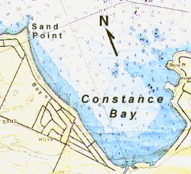Constance Bay is a prominent feature on this stretch of water. Sand Point is located in the northwest corner of the bay, and the area just south of it is a very popular day anchorage for those who like to stop for a swim. While the point remains a distinguishable landmark on the river, it is far less impressive than the large sand bluff that used to exist on this spot during the days when the Ottawa River was the major fur trading route into North America. Historical notes indicate that by the early 1900's much of the bluff had been carted away for "building purposes".