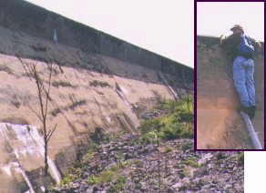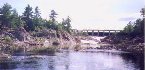 Although not as picturesque as the original falls, the dam and it facilities are still interesting to visit. Crews of boats anchored in the southeast corner of Pontiac Bay often climb the hill to get a first hand look of the control gate, spill ways, and the dykes on the western side of the dam. However, people using this route to get to the structure will find that it is a challenge to get a look on the other side of the dam, as demonstrated by the inset in photo to the left. (Although it may not be evident from the photo, I was precariously balanced on top a 10 foot post when I finally got to look over the dyke.) By going ashore in the southwest corner of Pontiac Bay (near the rock-cut), it is possible to get on the dyke. People can then walk along the top of the dyke towards the control gates for a commanding view overlooking the Ottawa River below the dam.