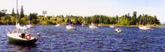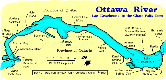 This part of the Ottawa River begins with Lake Deschenes in the City of Ottawa's west-end, and it continues up river to the Chat Falls hydro electric dam near the small town of Fitzroy Harbour. It includes a number of well equipped and surprisingly large marina facilities, several strategically placed overnight anchorages, various racing fleets, and over a thousand sailboats, many of which are in the 25 to 35 foot range.