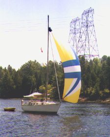 The high tension wires which cross the Woolsey Narrows are supported by 125 foot towers, although it is obvious that the wires sag considerably lower than this at the mid-point over the river. From an onboard perspective, a lack of depth perception may give the optical illusion that the boat's mast will come close to touching these electric power lines. All of this can be quite entertaining if an unsuspecting passenger is allowed to believe that the skipper is unsure if there is enough room for the mast to safely pass under these power lines.