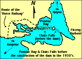 Although Pontiac Bay is difficult to get into, it appears to have been more navigable in the days before construction of the dam. In the 1800's, steam boats measuring a hundred feet or more in length would routinely make their way into the southwest corner of Pontiac Bay to deposit passengers travelling further up river. Here people would make their way around the Chats Falls on the "horse railway", which consisted of an open coach pulled by two horses over approximately three and half miles of track. At the other end of the railway people boarded another steam boat to continue their journey up the Ottawa valley.
