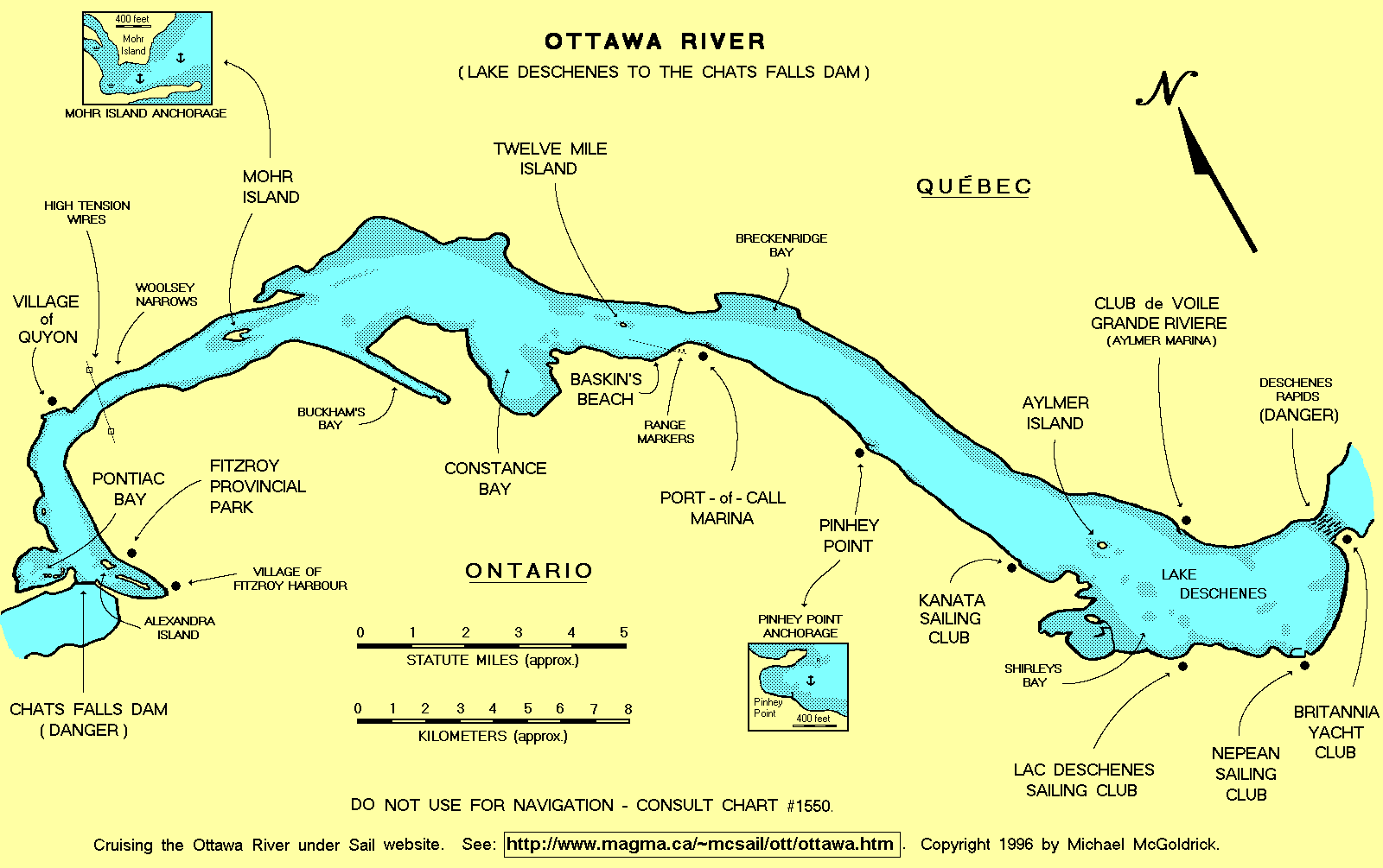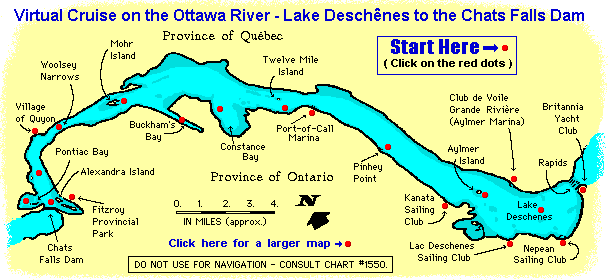 Click on the red dots on the map. It is best to start virtual cruise in the Las Deschenes area and head west towards Mohr Island or Pontiac Bay ( or click here to start).